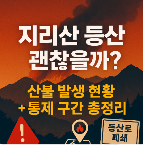 지리산 일대에 현재 산불은 없지만, 주변 지역에서 산불이 발생하거나 위험이 높은 상황입니다. 따라서 실시간 산불 정보와 등산로 통제 정보를 함께 체크한 후 등산 여부를 결정해야 합니다. 지금처럼 산불 경보가 유지되고 있는 시기에는 등산을 연기하거나, 개방된 안전 구간을 선택하는 것이 좋습니다. 무엇보다 안전이 우선이며, 정보 확인만 잘해도 위험을 예방할 수 있습니다. ---