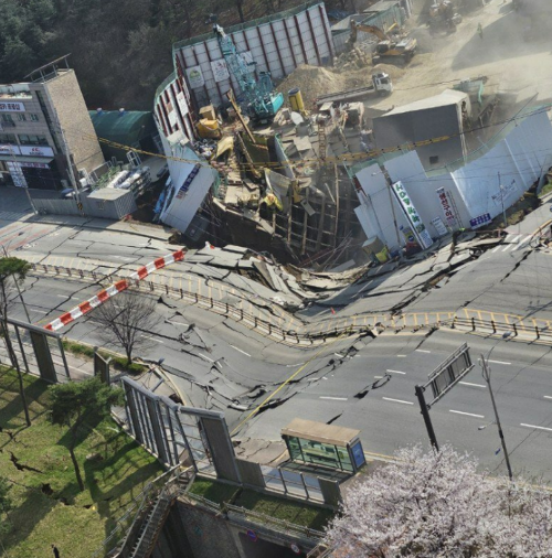 도로가 붕괴된 지역은 광명역에서 직선거리 300m 이내의 학교 두 곳이 위치한 지역입니다. 지하 공사 구간과 가까운 지역은 지반 이완, 공동(空洞) 발생, 지하수 유입 가능성이 높습니다.