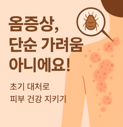 피부 가려움이 계속된다면 단순한 문제로 넘기지 말고 **옴증상** 여부를 반드시 확인하세요. 조기 발견과 신속한 치료가 건강한 피부를 지키는 지름길입니다.
