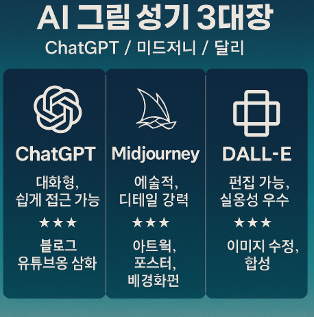 AI 기술이 발달하면서 텍스트만으로도 그림을 그릴 수 있는 시대가 왔습니다. 특히 ChatGPT, Midjourney(미드저니), DALL·E(달리)는 대표적인 AI 그림 생성기로 불리며, 많은 사람들이 블로그, 유튜브, SNS 썸네일에 활용하고 있죠. 그렇다면, 이 세 가지 툴 중 어떤 것이 가장 뛰어날까요?